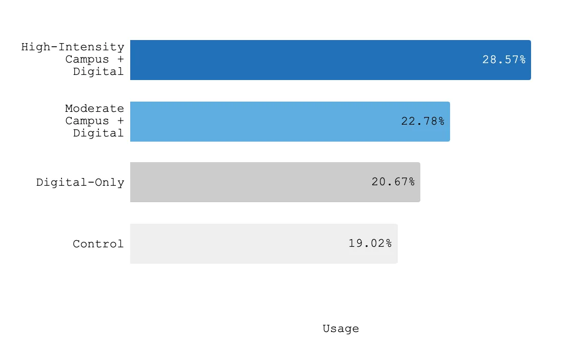 Campuses were assigned to four treatment conditions ranging from digital-only exposure to high-intensity on-campus saturation. Across usage, perceived popularity, feature awareness, and subscription indicators, outcomes improved systematically with treatment intensity.