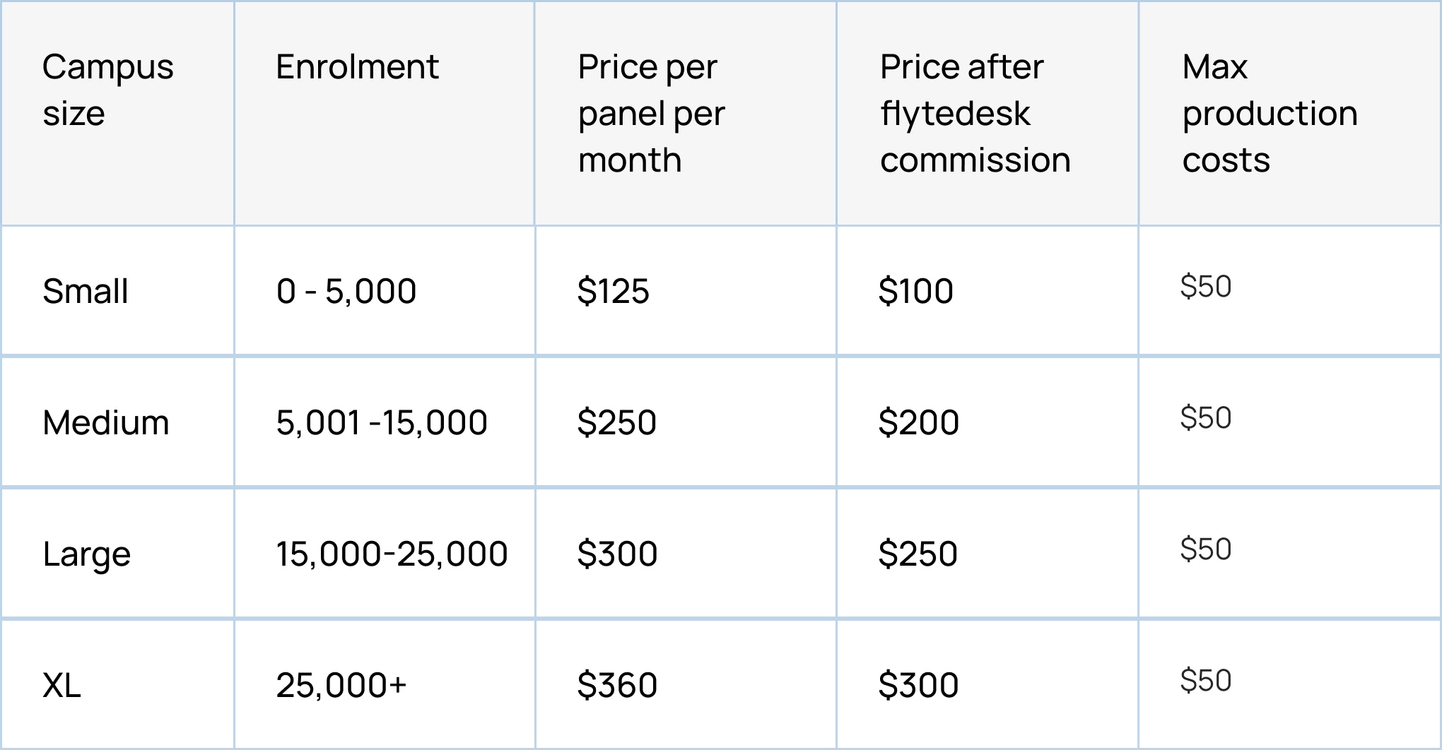 We’ll cover 100% of the costs of manufacturing and shipping the newsracks, as well as custom-to-your-organization branding (design, production, and shipping costs) for the lower panels, in exchange for three months of ad space for free to offset the costs. You own the newsracks outright, flytedesk maintains no ownership over the racks. You can sell them to local and national advertisers, and we’ll book ads on a first-come first-served basis like any other buyer. The only other thing that we ask for is for you to agree to sell us the racks for the prices specified below to help us keep pricing standardized for our national buyers.